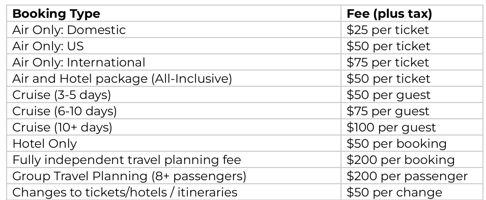 The table below showcases the different professional service fees that are applicable to your booking with this Travel Advisor.